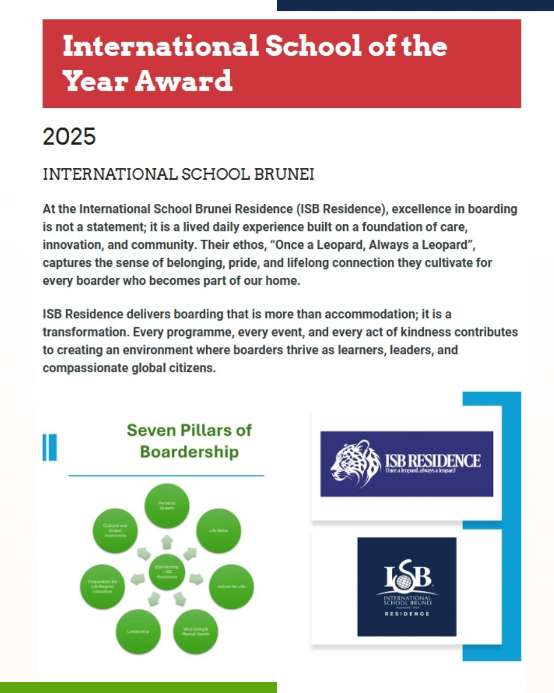 Thursday, 4th December 2025&²Ô²ú²õ±è;– International School Brunei (ISB) is proud to be named the 2025 International School of the Year by the Australian Boarding Schools Association (ABSA). This prestigious honour fully reflects the outstanding world-class boarding provision at ISB.